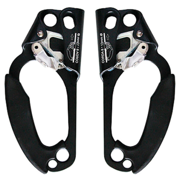 Bloqueador de mão, com punho, utilizado para ascensão/progressão. Simples de usar e eficaz, possui empunhadura moldada garantindo um ergonomia e uma aderência confortável. Possui dispositivo bloqueador mordente (dentado) e conta com dois orifícios localizados na sua parte inferior, facilitando a conexão ao cinto, orifício maior e o pedal ou estribo no orifício menor.