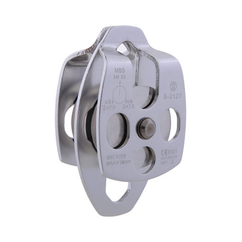 Polia dupla grande articulada em aluminio acabamento anodizado para corda de diametro até 16mm; resistência 30kn; peso 423g.